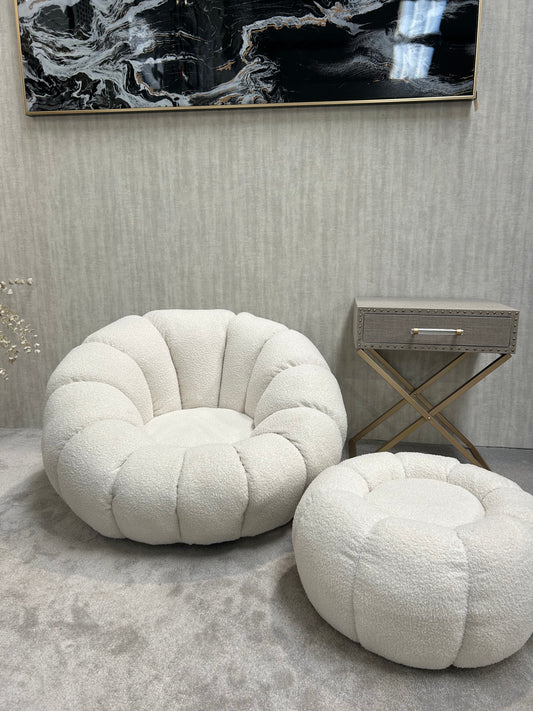 Teddy Boucle Fabric White Mirielle Swivel Accent Chair with Footstool