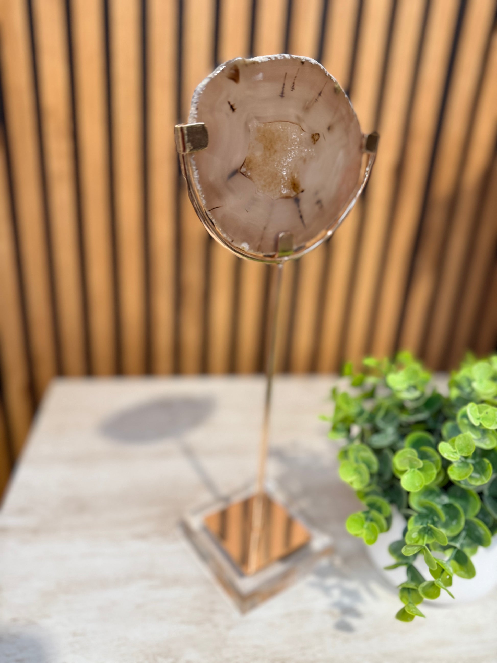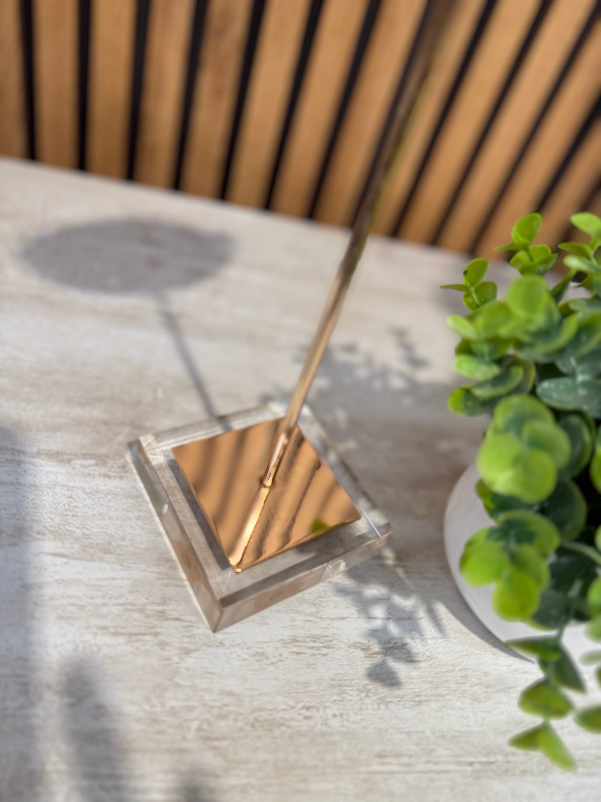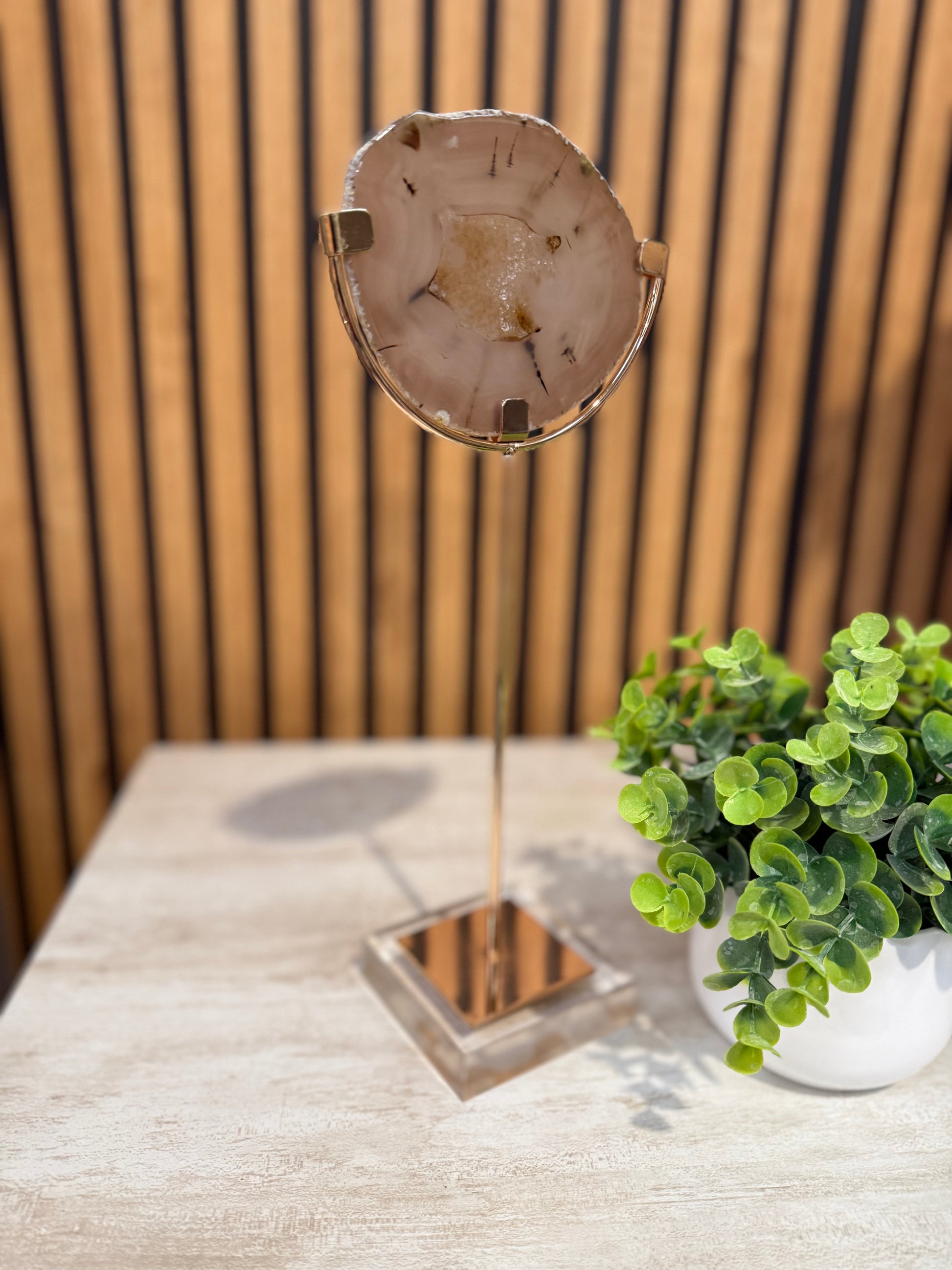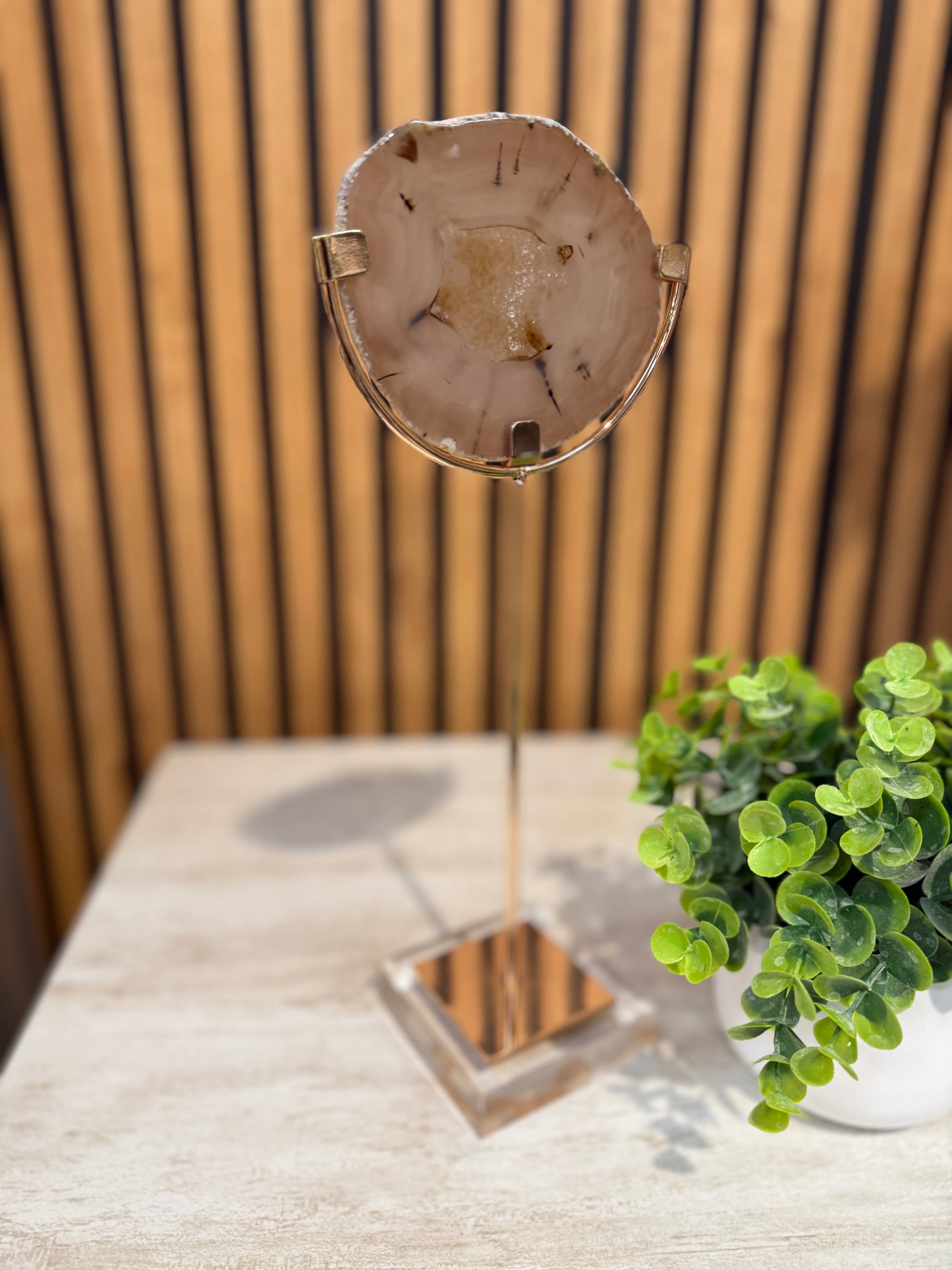 A perfect accessory to add to your styling, with the beautiful piece of Agate the rose gold stand and glass square base brings elegance and sophistication to any room decor.