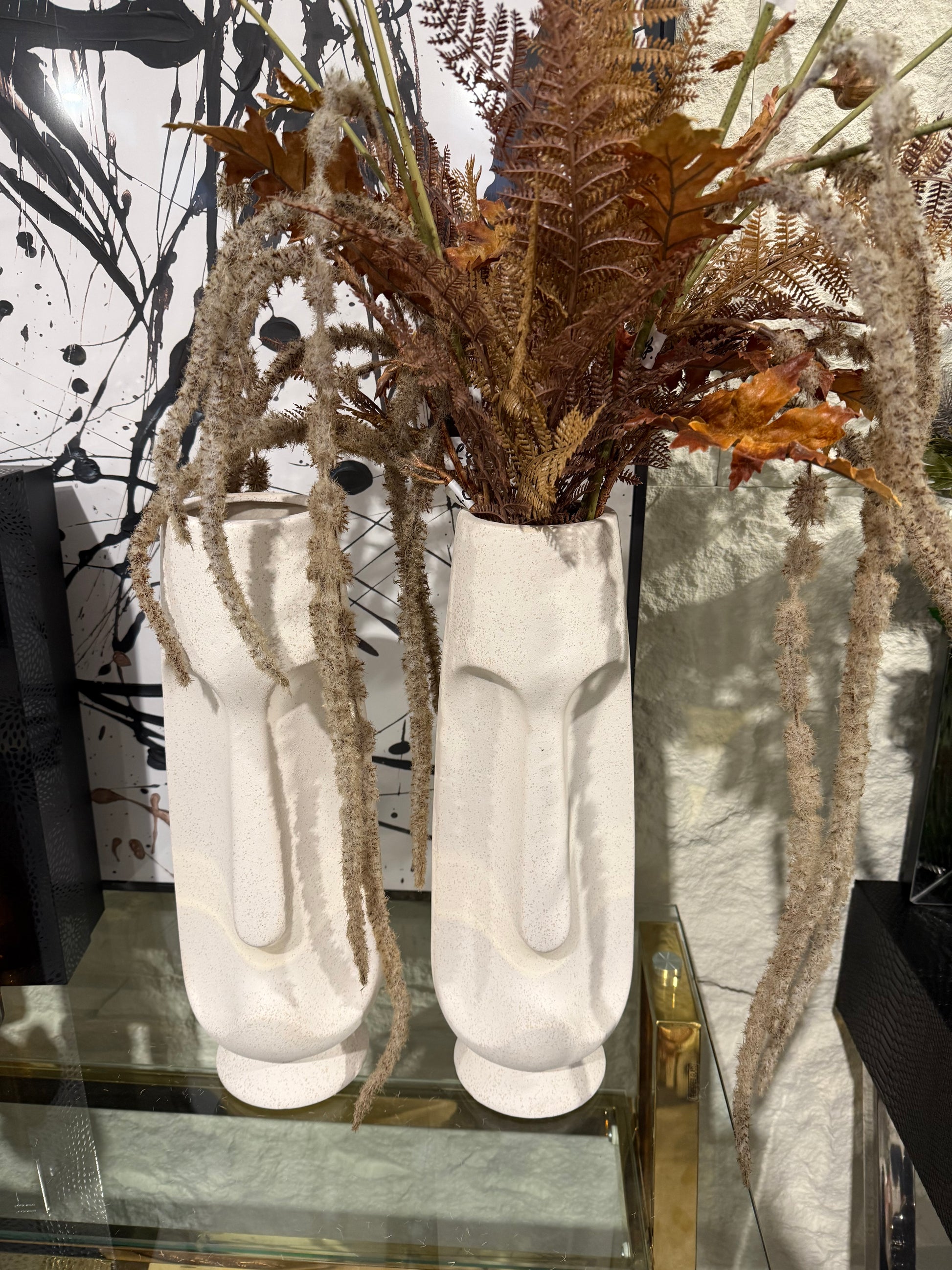 Elevate your space with this unique Cream Speckled Face Vase with a large open neck to add your blooms or it is beautiful on its own.
