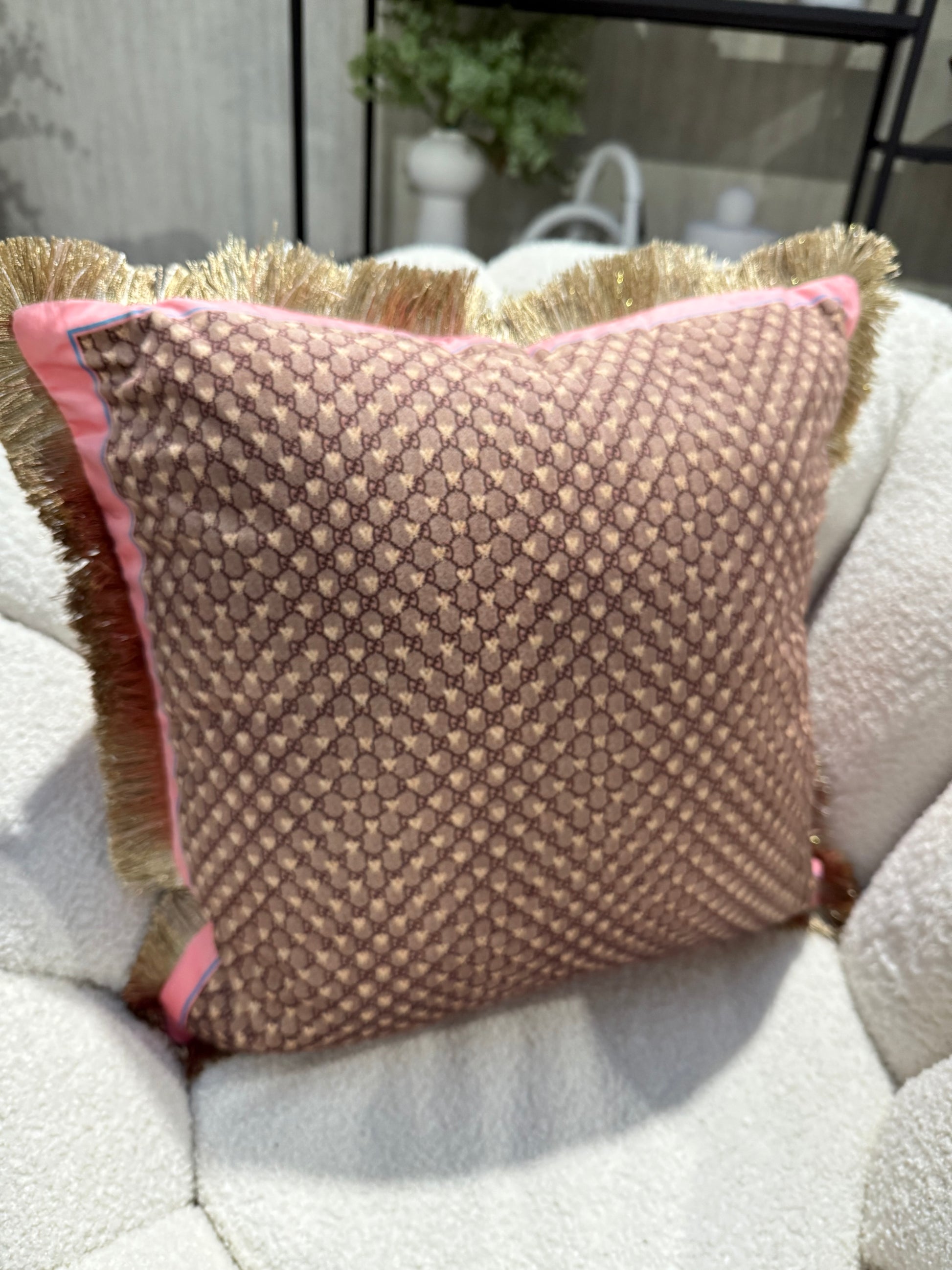 Why not add a bit of colour to your styling with our gold & champagne patterned cushions,also they have a striking pink border and gold fringe.