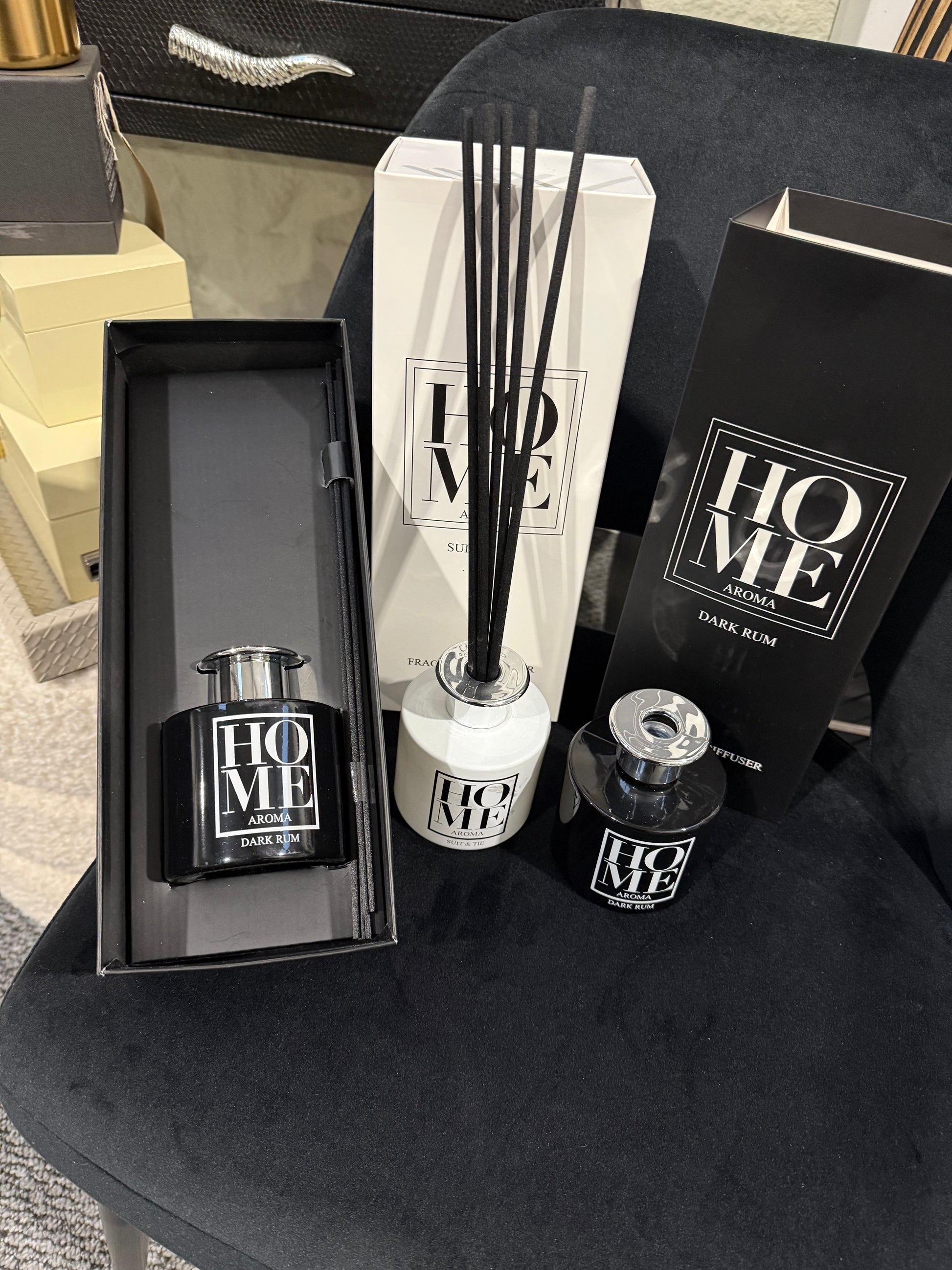 Elevate your space with our Home Diffusers comes in a beautiful gift box with reeds, 2 sences to choose from Dark Rum and Suit & Tie.