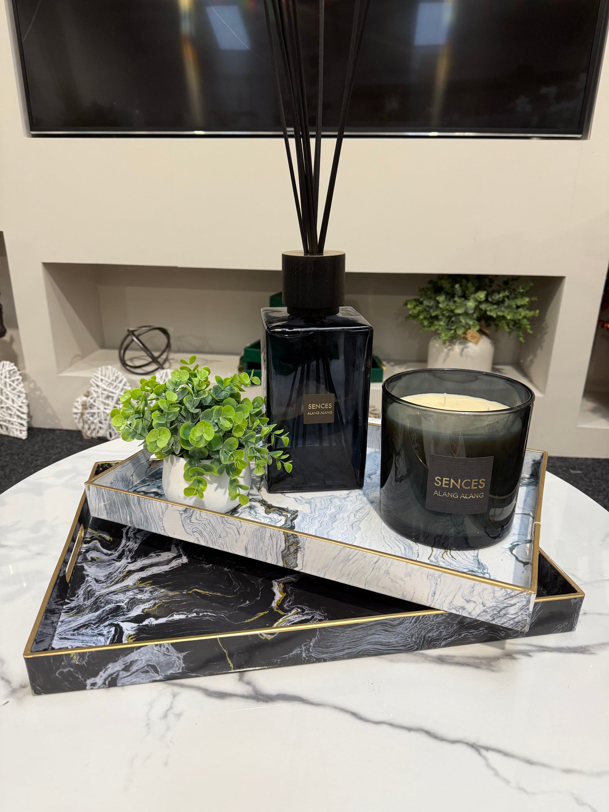 Our Marble Tray set with marble effect pattern piped in gold edging is the ideal set to add to your coffee table, either put together as a set or individually.
