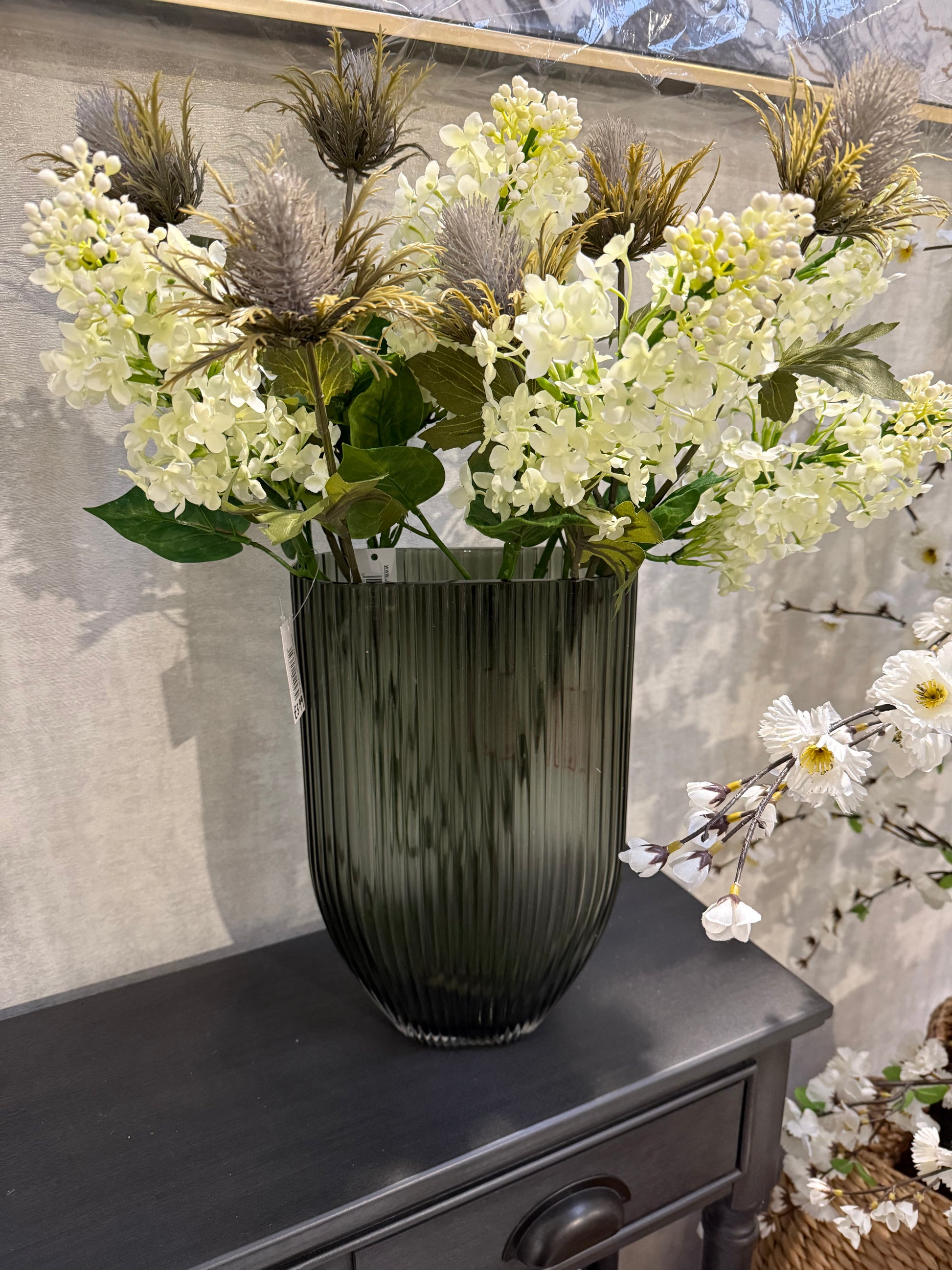 Our Smoked Glass Ribbed Vase with a large open neck to fill with all your beautiful faux flowers or blooms. It is a statement piece to stand alone on your media wall.